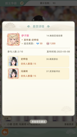5)悬赏完成后,【发布者】将获取【钻石】和厨王徽记奖励。追击人数达到上限或者悬赏时间到后通过邮件发送奖励。(所以悬赏发布后,可以喊上协会的各位店长一起追击噢,这样子双方都能更快的获取钻石及厨王徽记奖励。)